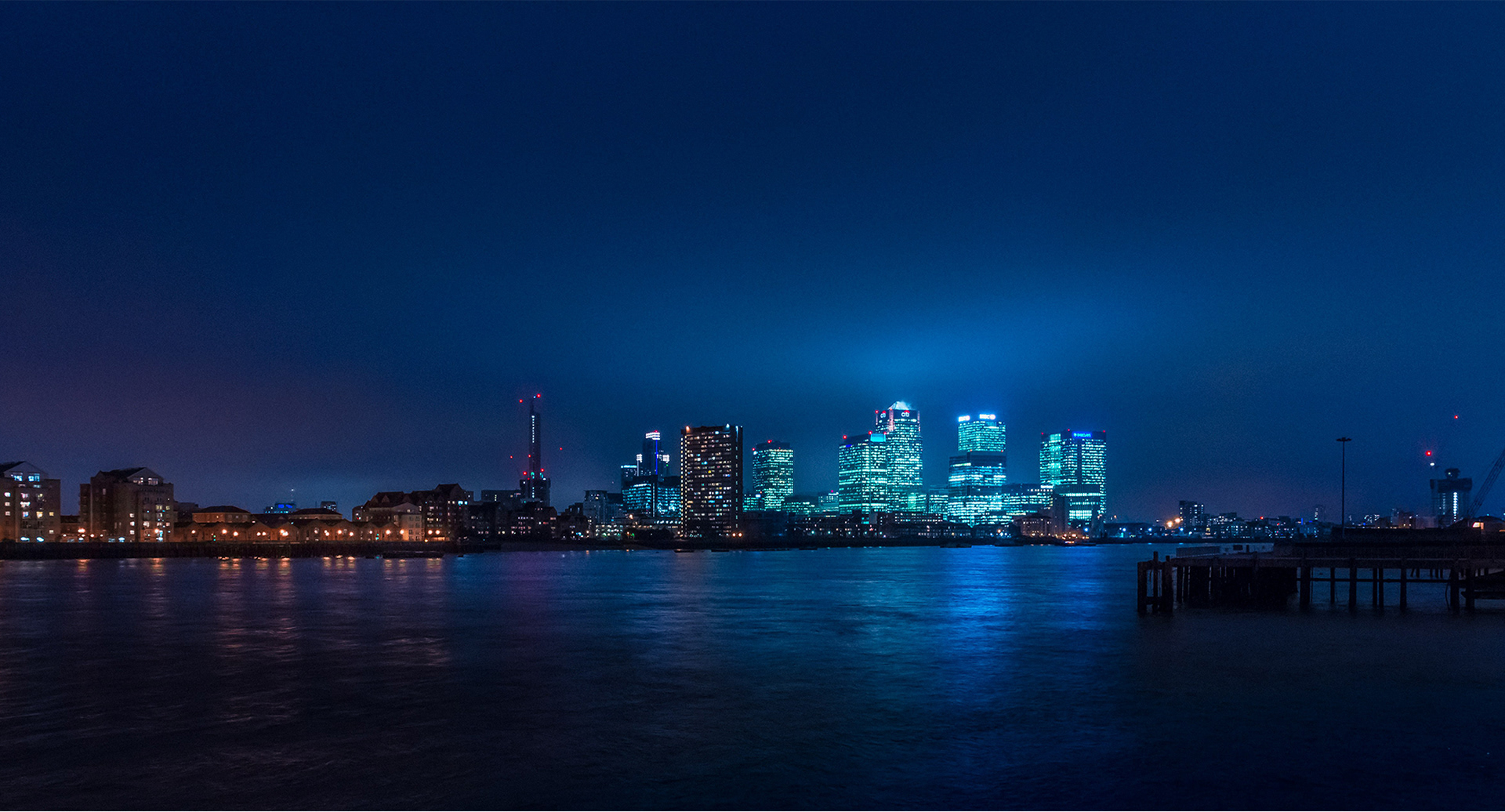 Evening view of Canary Wharf from the south side of the river.